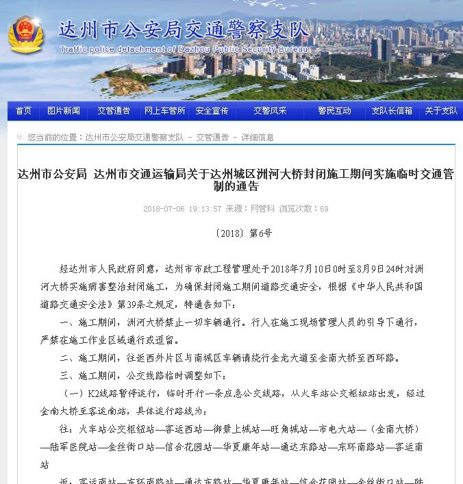 經(jīng)達(dá)州市人民政府同意,達(dá)州市市政工程管理處于2018年7月10日0時至8月9日24時對洲河大橋?qū)嵤┎『φ畏忾]施工,為確保封閉施工期間道路交通安全,根據(jù)《中華人民共和國道路交通安全法》第39條之規(guī)定,特通告如下: